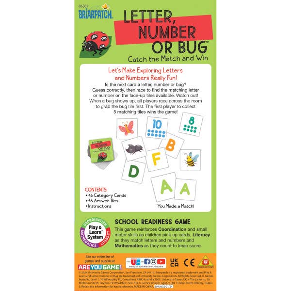 Let's Make Exploring Letters and Numbers Really Fun! Is the next card a letter, number or bug? Guess correctly, then race to find the matching letter or number on the face-up tiles available. Watch out! When a bug shows up, all players race across the room to grab the bug tile first. The first player to collect 5 matching tiles wins the game!