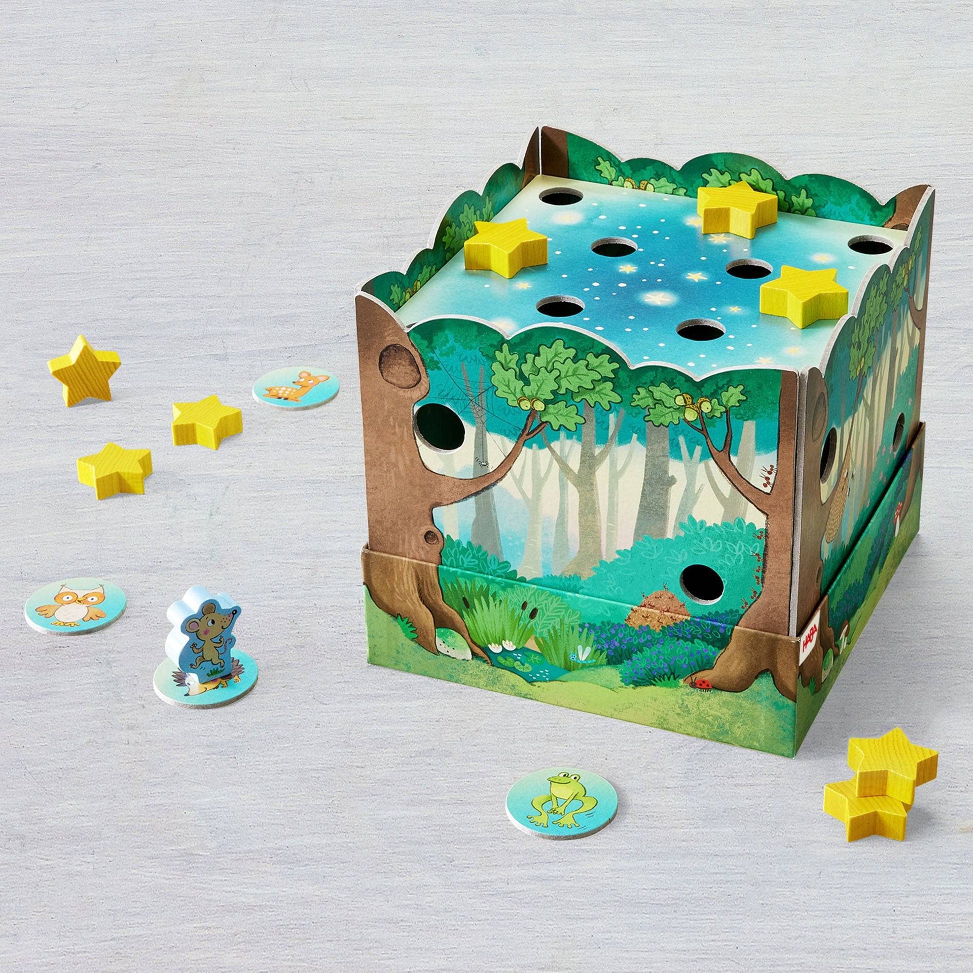 * In no time at all, the 3D game setup transforms into a dense forest with peepholes and wooden stars sparkling in the sky.