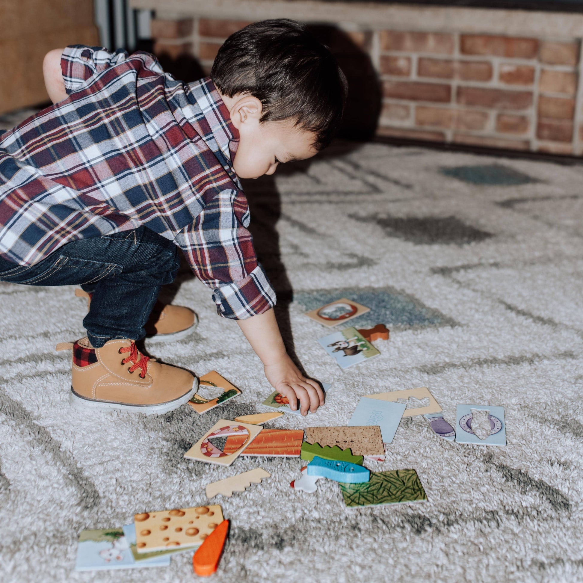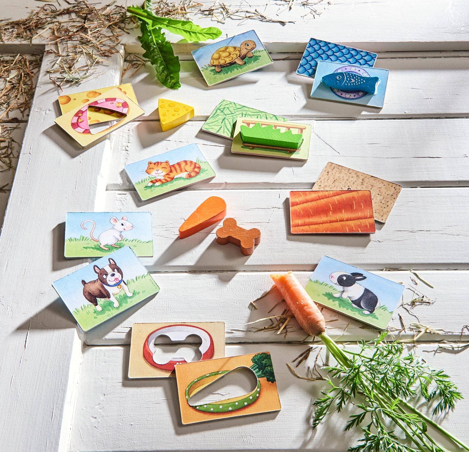 What does a cat, a tortoise, or a mouse eat? And which foods taste best for a rabbit or a dog? The children can work together or apart to find out in this collection of small games. Match the animal cards, wooden food pieces, cut-out cards, and color cards together to feed all the pets. The animals will nibble, munch, and crunch all their food up in no time! Play together and learn colors, shapes, and animals with this collection of small games. Two matching memory games in one.