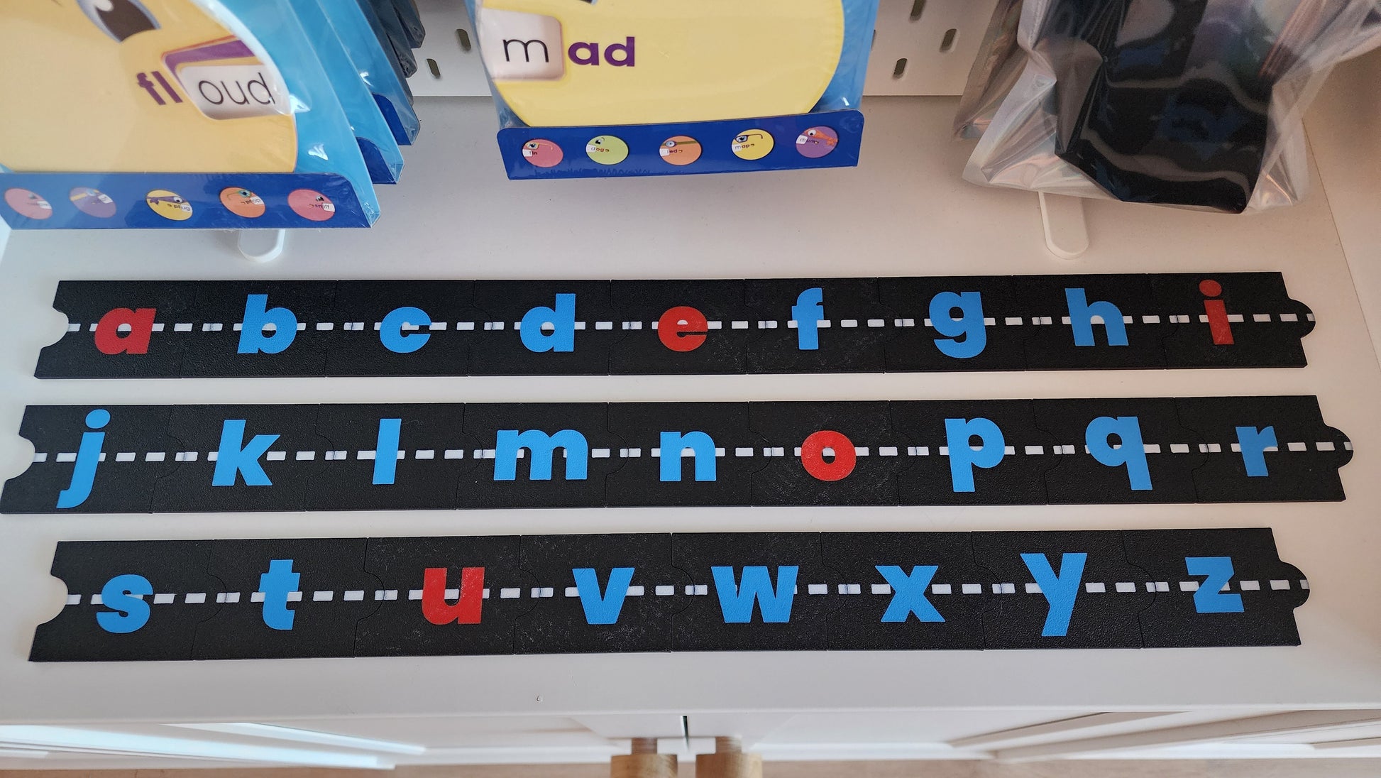 Build words and drive toy cars on them as you sound them out. This set includes 26 pieces. Consonants are blue and vowels are red.