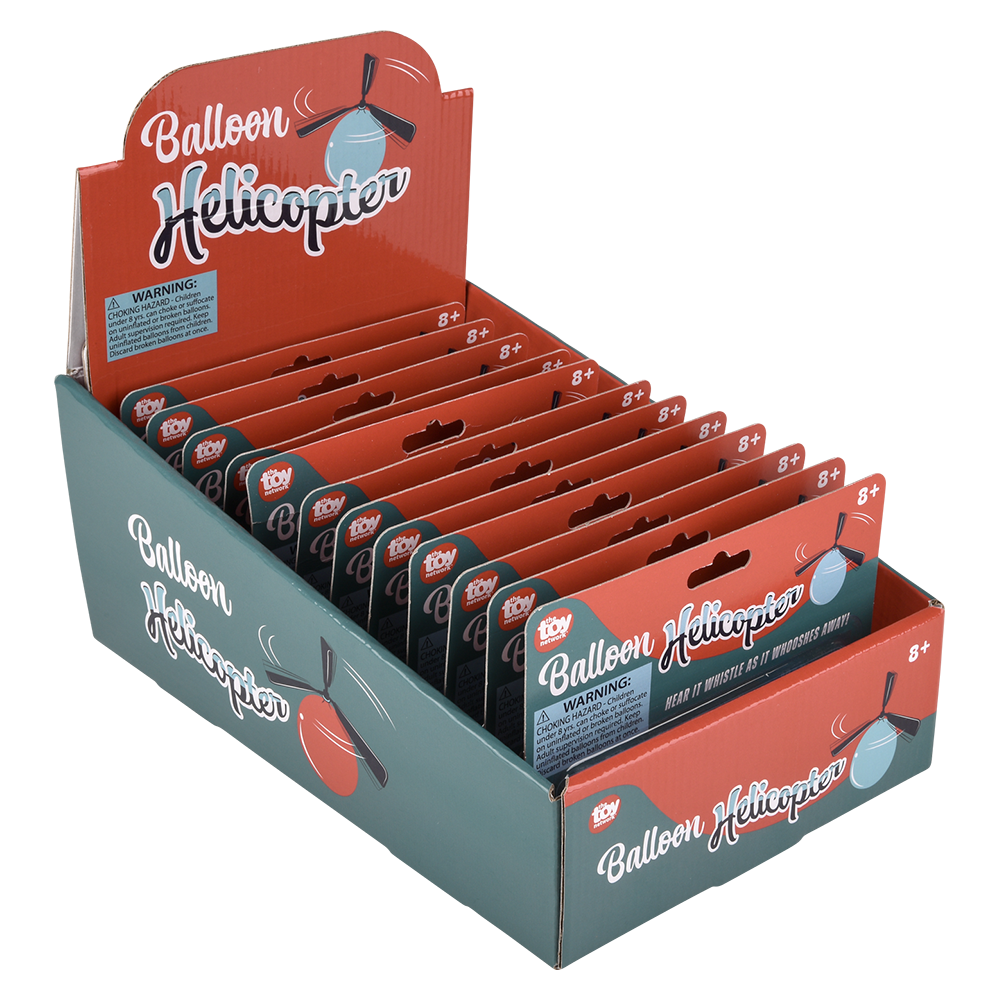 Build these Balloon Helicopters to watch them whistle through the sky. Great interactive toy. Assorted colors. Each set is in a poly bag. 12 sets sold in a display.